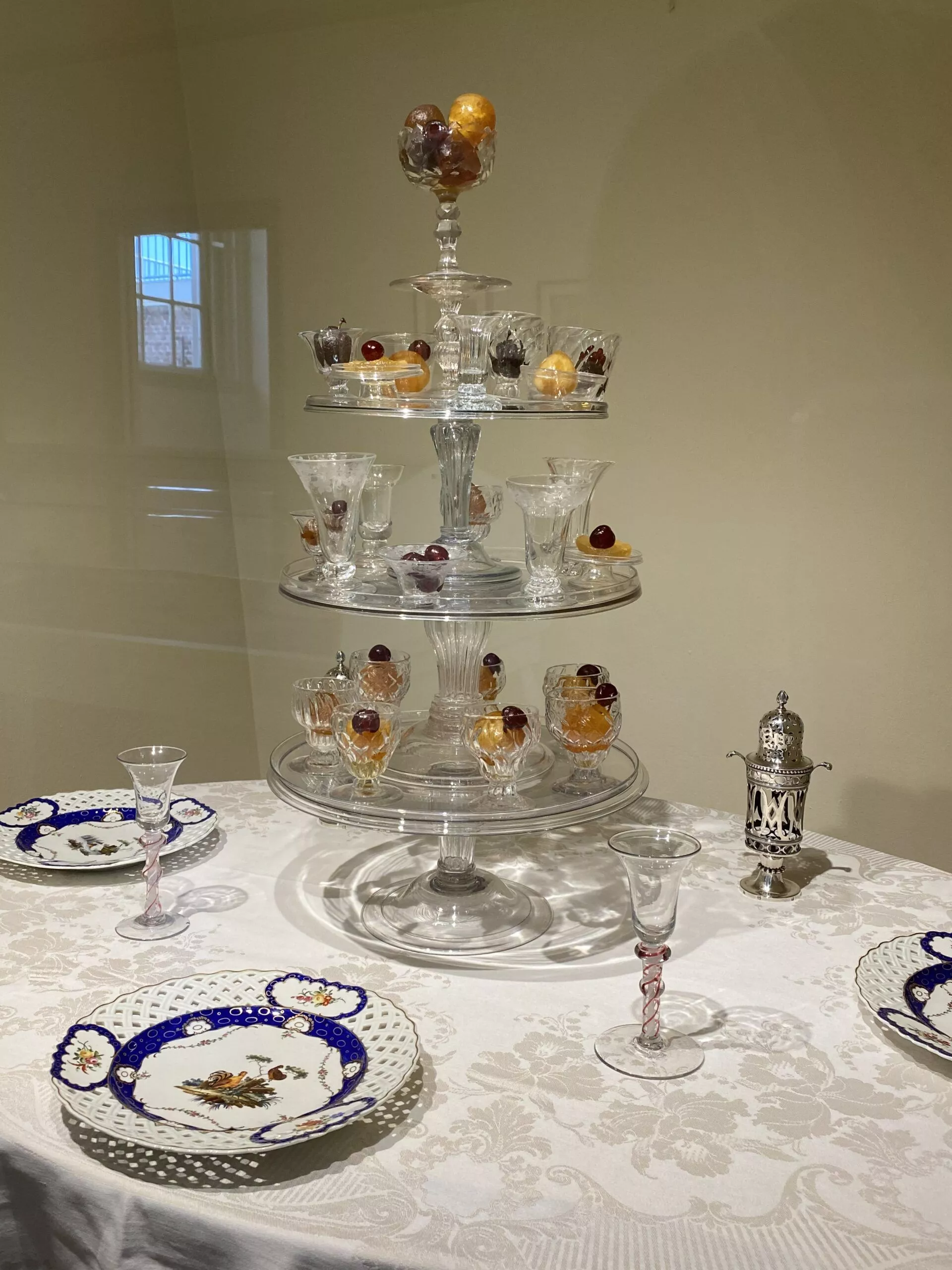 Op de verrukkelijke tentoonstelling Grand Dessert in het Haagse Kunstmuseum staat een bijzonder glazen plateau uit de achttiende eeuw, afkomstig uit het Dordts Patriciërshuis. Het gaat om een etagère van drie verdiepingen, met bovenop een fraaie coupe als vierde laag. Op de drie plateaus staan diverse glaasjes en schaaltjes, sommige van geslepen en andere van geribbeld glas. In dergelijke glaasjes en schaaltjes werden zoetigheden geserveerd, als dessert na de maaltijd bijvoorbeeld. In een grote stad als Londen kon je in de achttiende eeuw overdag ook bij speciale winkels naar binnen lopen om al lepelend of met een kleine vorkje zo’n glaasje zoetigheid te nuttigen. Die zoetigheden waren soms vloeibaar, soms meer gelei-achtig. Of denk ook aan gekonfijt fruit! Recepten daarvoor staan volop in de Nederlandse kookboeken.